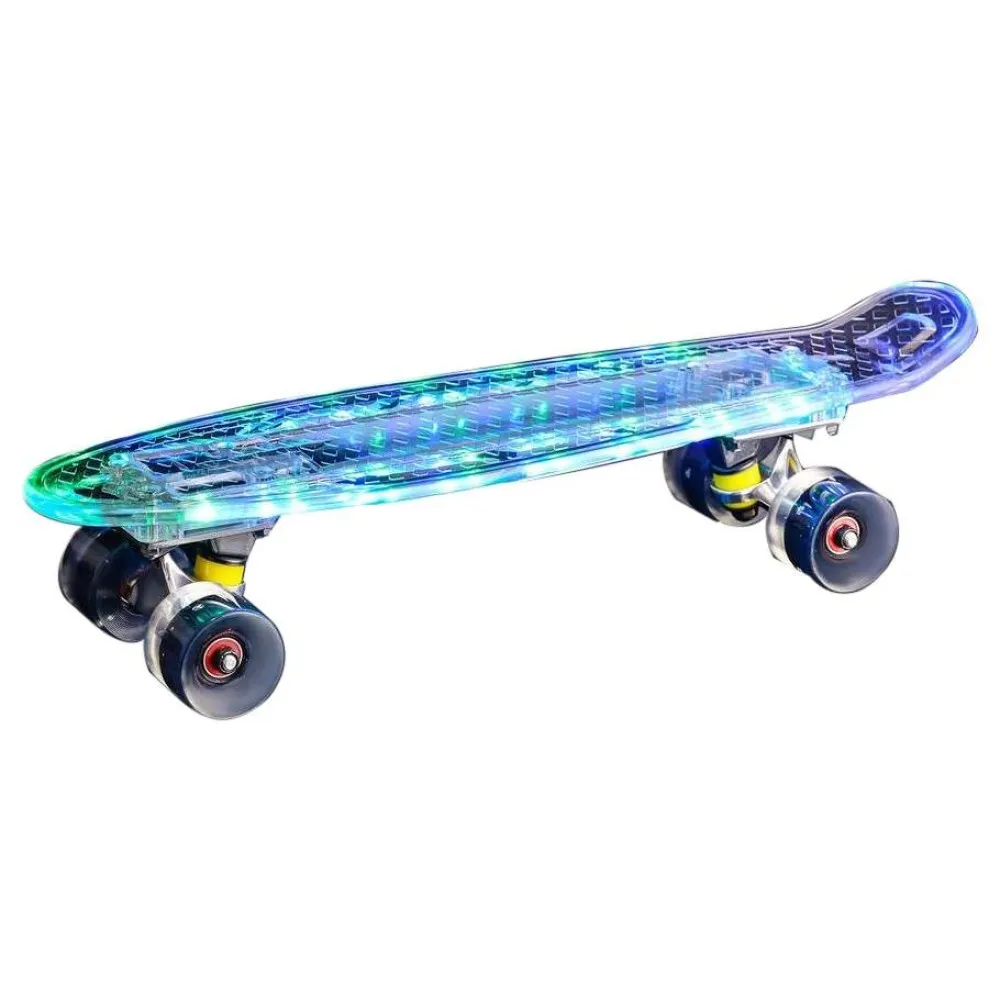 Любишь кататься на скейте, хочешь быть всегда в центре внимания и гарантированно блистать на любой площадке? Тогда этот пенни борд "FISH"- то, что тебе нужно! Уникальный, яркий, манёвренный и надежный, он не оставит равнодушным никого. Его особая конструкция из прозрачной доски в сочетании с яркими светящимися колесами сделает тебя звездой райдеров!