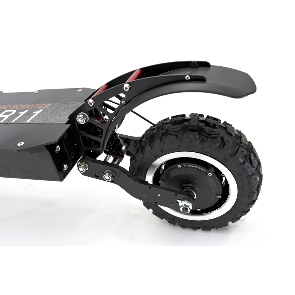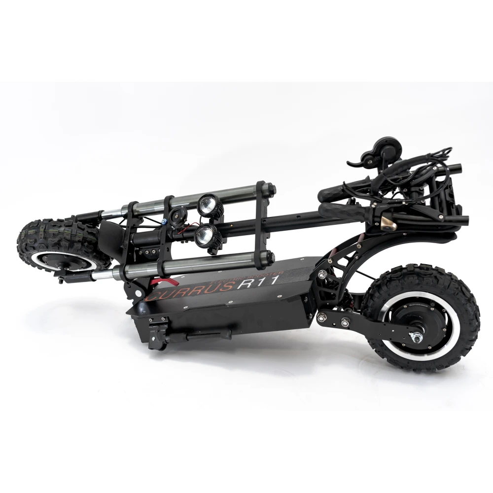 Currus R11 с усиленной рулевой стойкой, гидравлическими амортизаторами впереди и маятниковым сзади. Электросамокат имеет полный привод, общая мощность агрегата 3200 Вт. С возможностью отключение одного двигателя при необходимости. Транспортное средство развивает максимальную скорость свыше 80 км/ч. Повышенная емкость батареи до 32 А*ч позволяет преодолевать на одном заряде до 90 км пути.