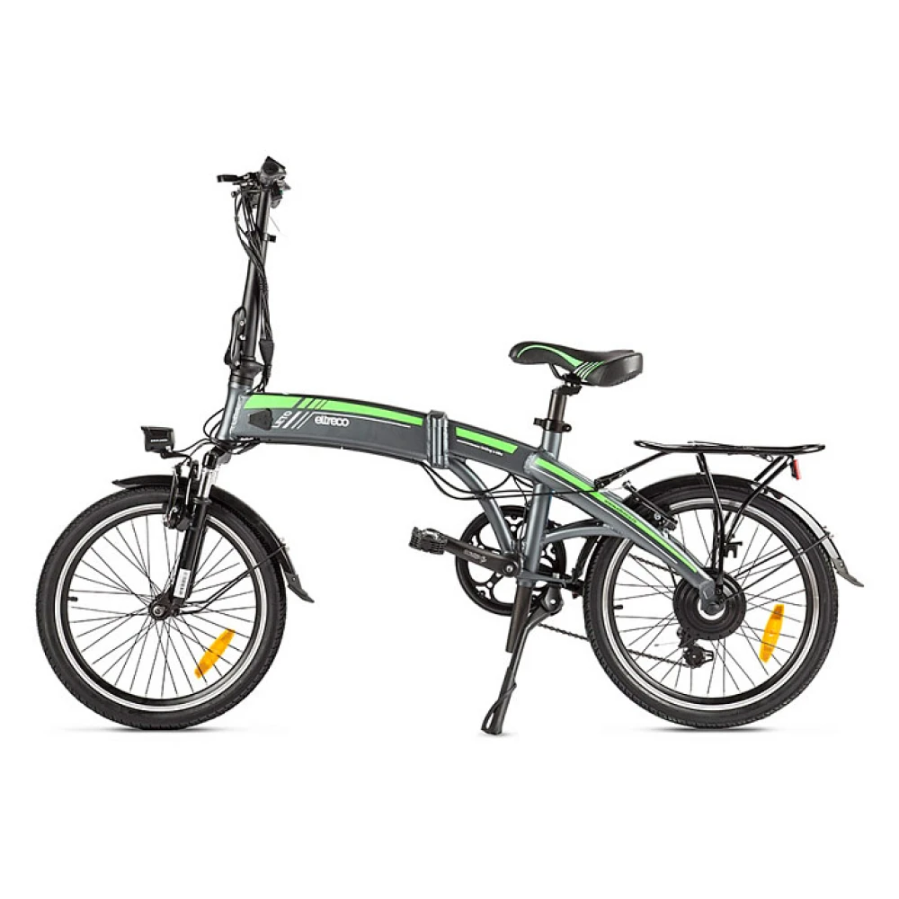 Над задним колесом расположен металлический багажник для надежной фиксации личных вещей. 20-дюймовые колеса повышают маневренность электровелосипеда, а амортизированная подвеска позволяет комфортно преодолевать неровности дороги. Велогибрид Eltreco LETO весит меньше 22 килограммов и имеет складную конструкцию. В сложенном виде данная модель настолько компактна, что без труда поместиться в пассажирском лифте или багажнике автомобиля.