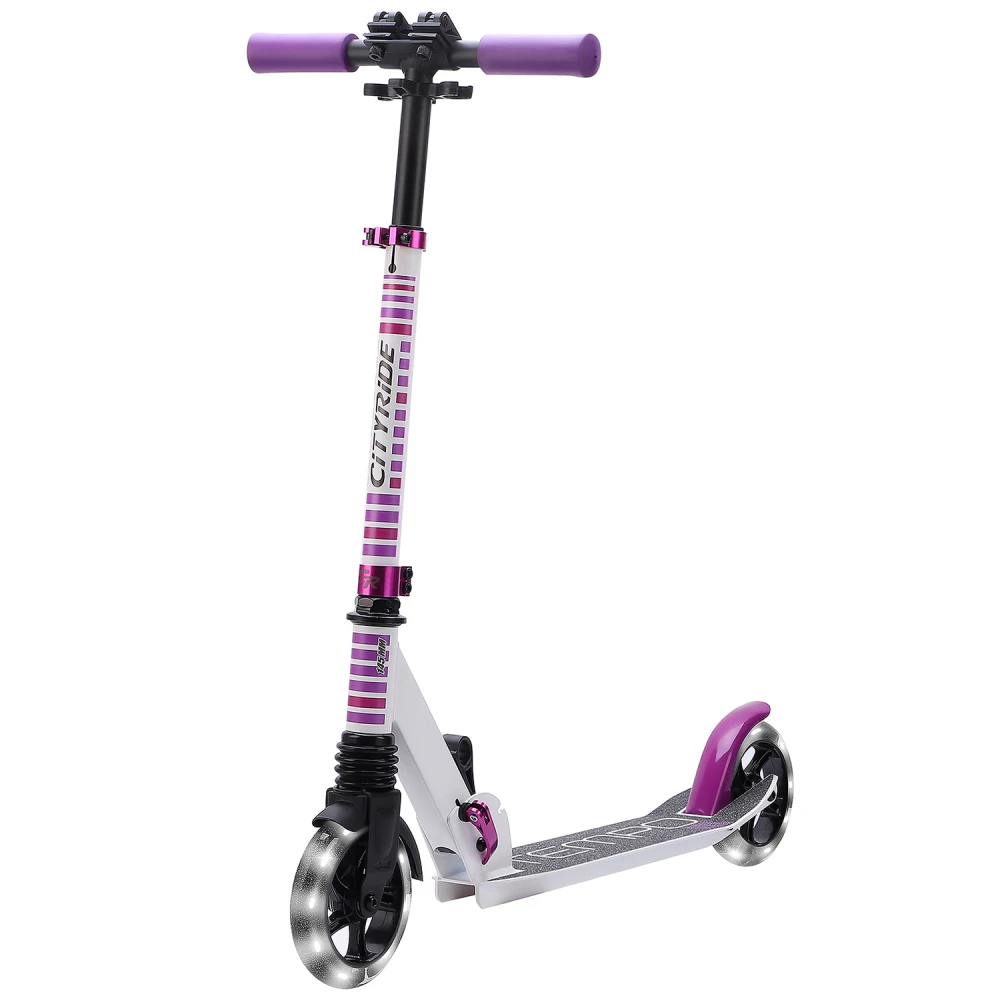 Двухколесный самокат CITY-RIDE TEMPO бело-фиолетового цвета – модель со складной конструкцией рассчитана на простую перевозку в багажнике автомобиля. Техника принесет радость и хорошее настроение маленькому ездоку (старше 3 лет), позволит принимать первые взрослые решения. Алюминиевая платформа для ног 100 мм*480 мм широкая, подойдет для быстрой езды, поскольку имеет нескользящую структуру. Наш интернет-магазин предлагает выгодное сотрудничество на равных условиях.