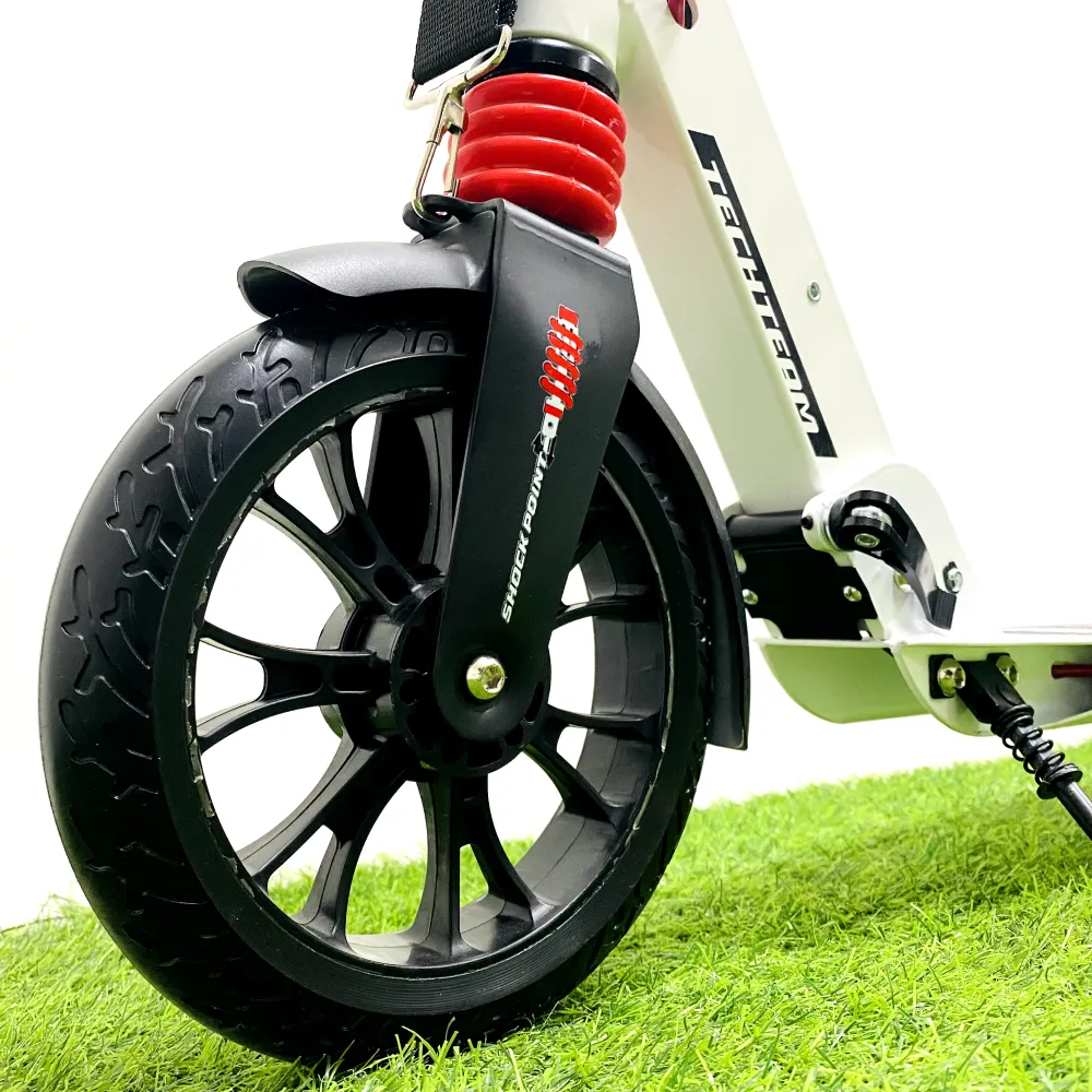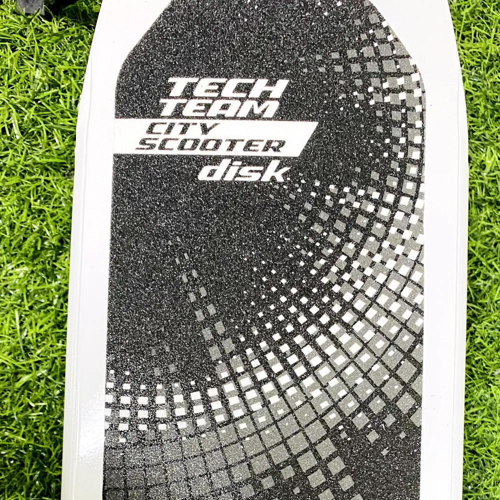 Самокат оснащен ручной дисковой тормозной системой. Украшенная по последнему писку моды техника привлекает внимание эстетически и технически.